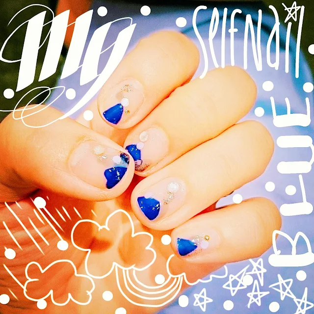 青のマニキュアを雑なフレンチネイルというか、爪の先にランダムに塗ります。
